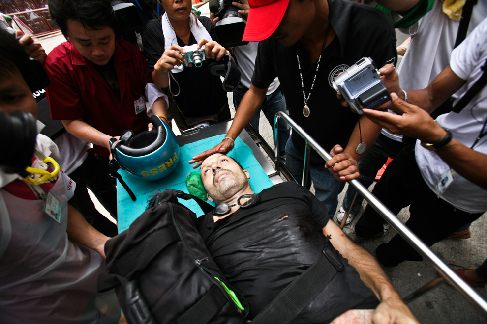 Freelance photographer Fabio Polenghi, 48, of Italy lies on a stretcher at Police Headquarter Hospital Wednesday, May 19, 2010, in Bangkok, Thailand, after being shot during a government crackdown on anti-government protestors. Polenghi was later pronounced dead by Thai doctors.