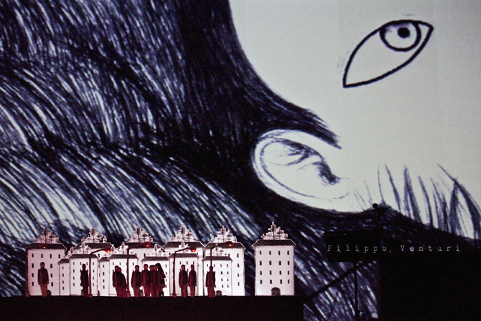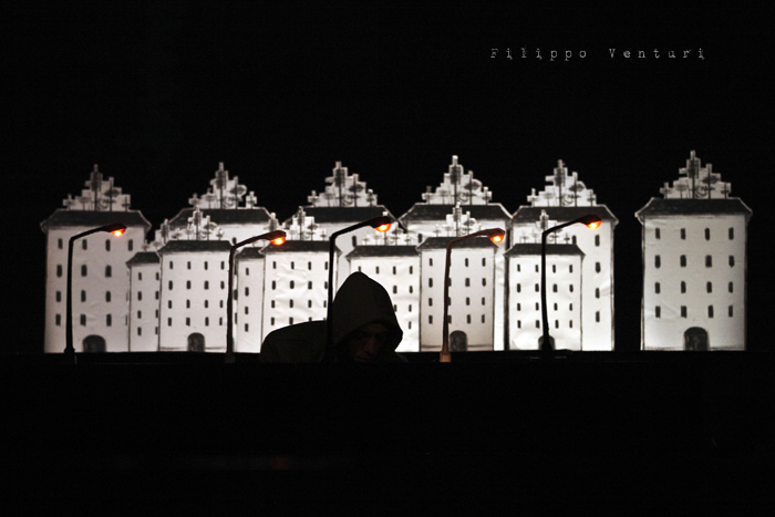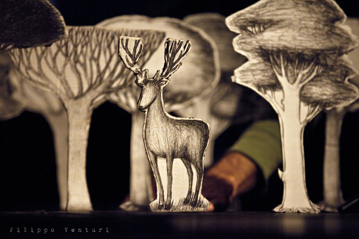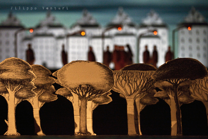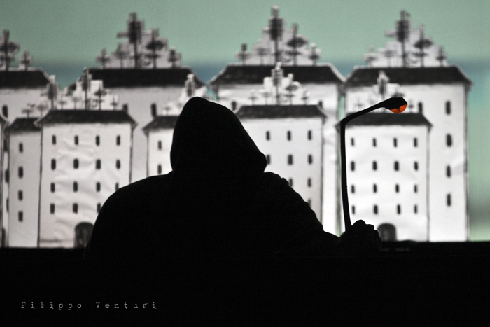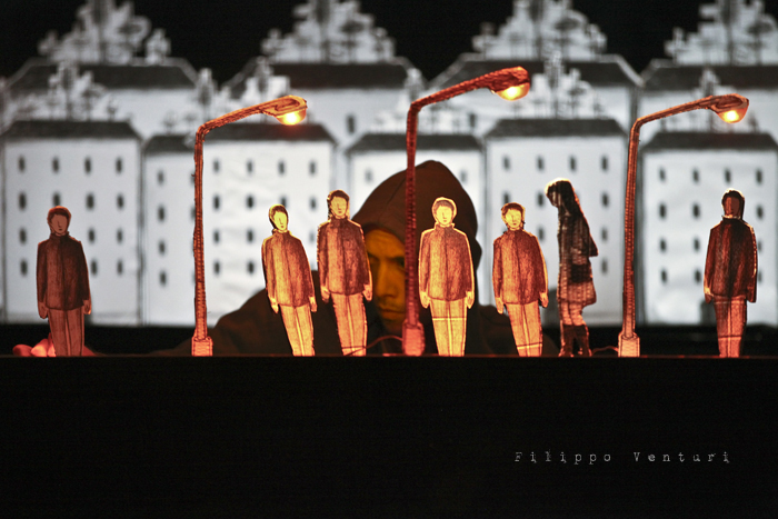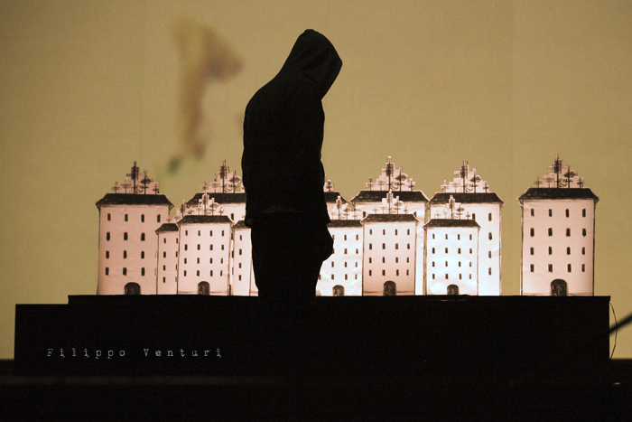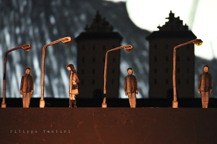 In scena quattro musicisti ed un attore che guidano e accompagnano il pubblico, con parole sussurrate che suggestionano l’ascolto e la visione, azioni volte alla costruzione dell’ambiente scenico, rumori, strumenti, note, melodie, timbri, silenzio, alla scoperta per piccoli frammenti di un paesaggio fisico e interiore, di un mondo che è troppo ricco di sfumature, emozioni, visioni e colori per rimanere immobili e non coglierne e amarne la poesia che vi trema all’interno. L’azione performativa, minimale, quasi microscopica, si dispiega durante tutto il concerto per ricostruire un paesaggio visivo, fragile, fatto di cartone, in bianco e nero. Un paesaggio leggero, effimero in costante cambiamento anche quello legato alle animazioni di Virginia Mori e la partitura video di Daniele Quadrelli. Le parole scritte da Roberta Magnani e interpretate da Leonardo Delogu popoleranno questi luoghi come sussurri, come vento che si insinua nelle fessure: ogni tanto qualche sagoma si affaccerà sulla porta. Il performer dalla penombra farà emergere luoghi, scorci naturali e urbani, luoghi della nostra vita e della nostra memoria, per poi farli ripiombare nell’ombra, dolcemente.