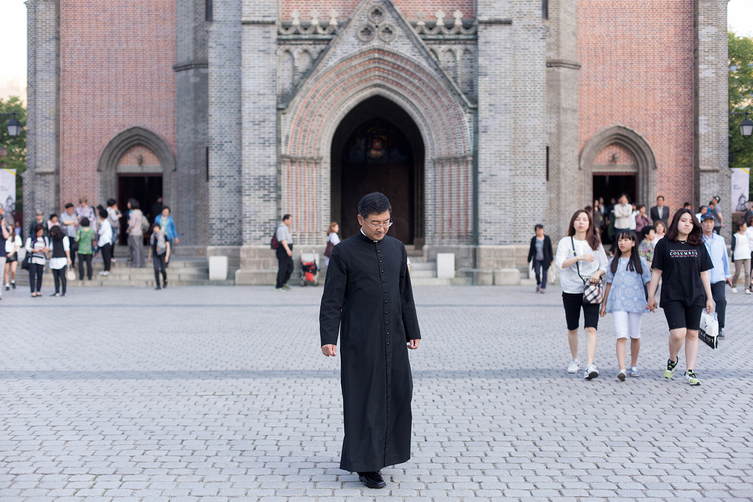 Prete davanti alla cattedrale di Myeong-dong a Seoul, una delle più vecchie chiese cattoliche del Paese (in realtà piuttosto recente, è stata infatti completata nel 1898). Quasi 1 coreano su 3 si dichiara cristiano, divisi tra cattolici romani e protestanti di varie denominazioni, una delle più grandi comunità asiatiche.
